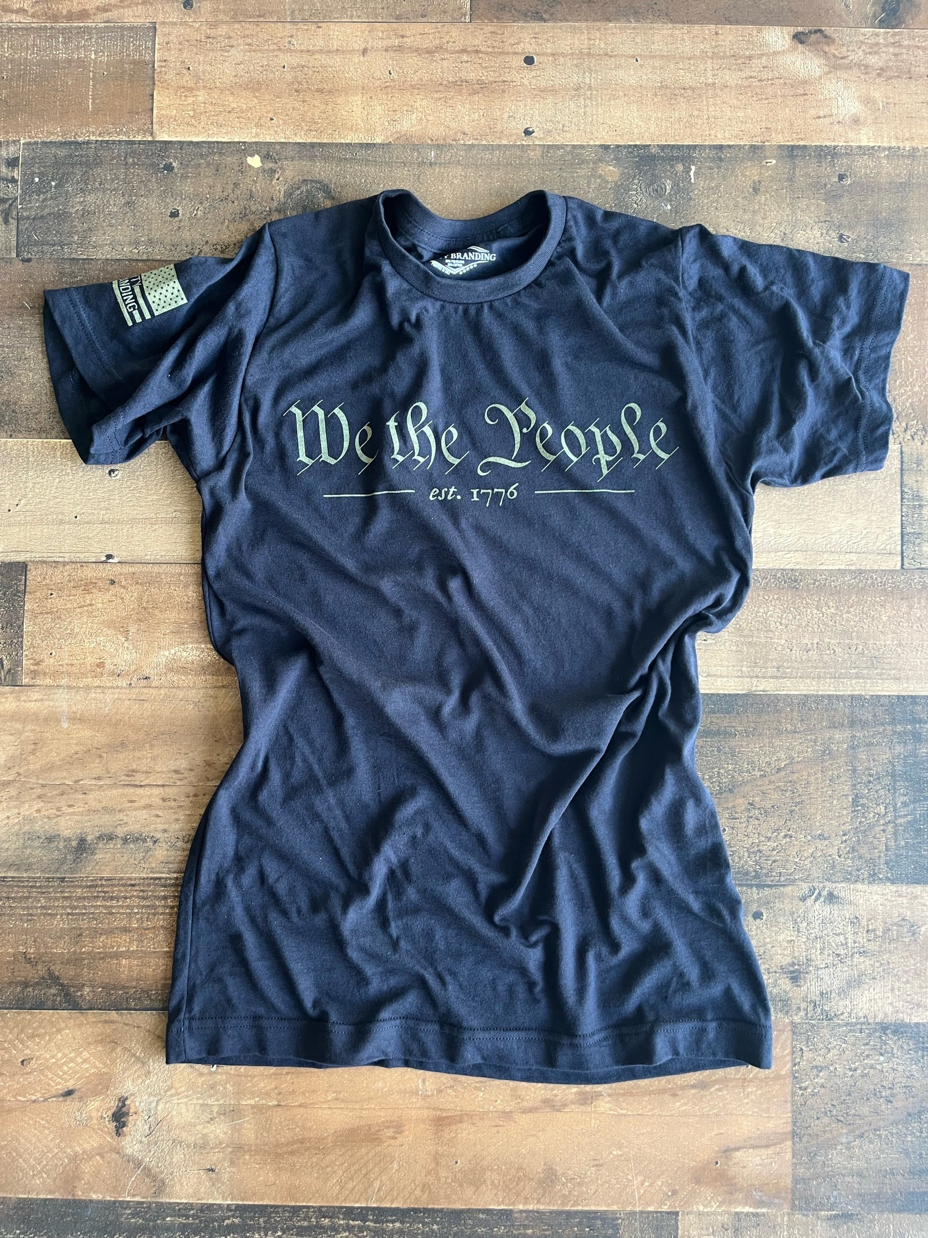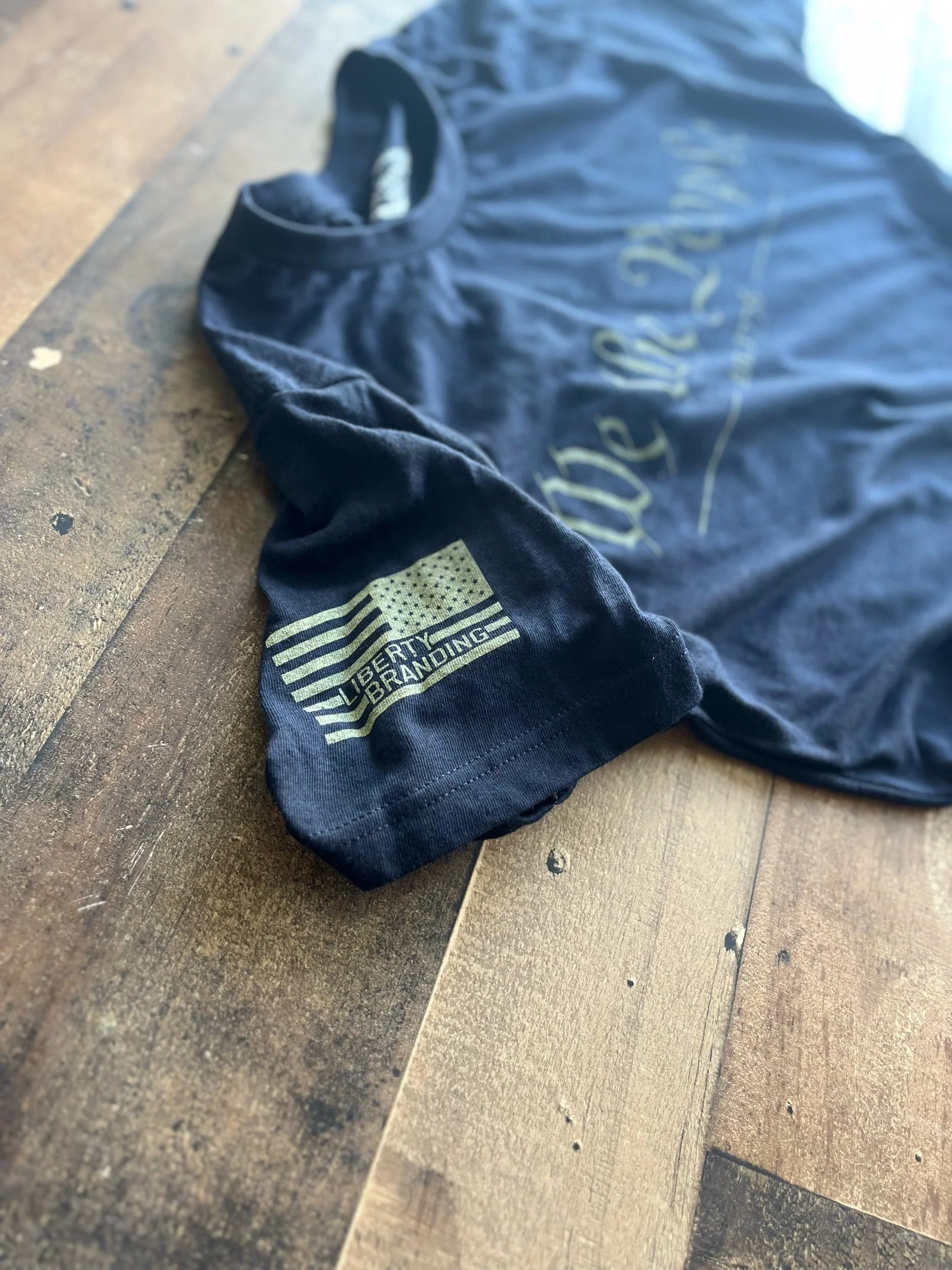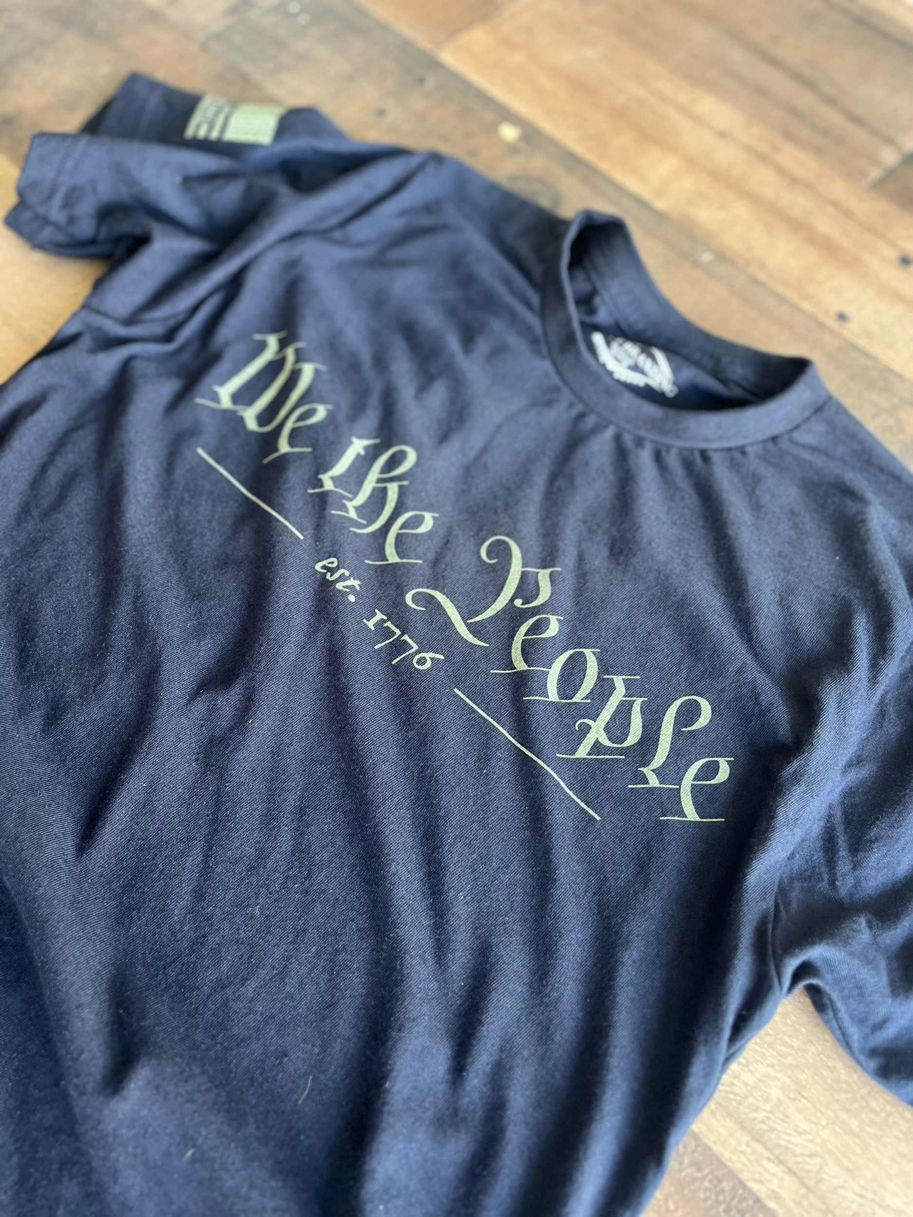 Shop Online › We the People Navy Tee Image 1 of 3 Image 2 of 3 Image 3 of 3 We the People Navy Tee $25.00 Navy/Tan - Unisex sizing3.6 oz. 65% polyester/35% combed ring-spun USA cottonTrue to size / preshrunk Size: Small Medium Large XLarge XX Large XXX Large Add To Cart Added! Navy/Tan - Unisex sizing3.6 oz. 65% polyester/35% combed ring-spun USA cottonTrue to size / preshrunk